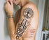 Dieses Tattoo-Design ist eine kraftvolle Komposition aus der nordischen Mythologie, die tiefgreifende spirituelle Konzepte miteinander verwebt. Jedes Element trägt eine spezifische Last an Geschichte und Bedeutung. An der Spitze steht Yggdrasil, die riesige Esche, die die neun Welten verbindet. Sie symbolisiert das Gleichgewicht des Universums, das Leben, das Wachstum und die Unvergänglichkeit. Die Wurzeln und Zweige verdeutlichen, dass alles im Leben miteinander verbunden ist – Himmel, Erde und Unterwelt. Zusammenfassend ist dieses Tattoo ein Manifest für jemanden, der innere Stärke, eine tiefe Verbundenheit zu seinen Wurzeln und den Schutz durch höhere Mächte sucht. Es vereint die raue Natur der Wikinger mit der philosophischen Tiefe der Unendlichkeit.